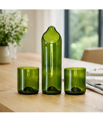 Carafe en verre recyclé fabriquée à partir d’une bouteille de vin surcyclée. Pièce artisanale unique, façonnée à la main dans les Hauts-de-France. Compatible lave-vaisselle.