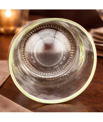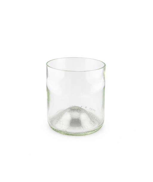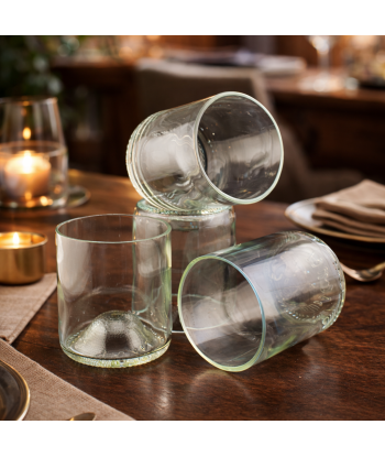 Lot de 4 verres short drink transparents, façonnés artisanalement à partir de bouteilles de vin blanc ou rosé surcyclées. Des verres du quotidien, sobres et durables, pour une table engagée.
